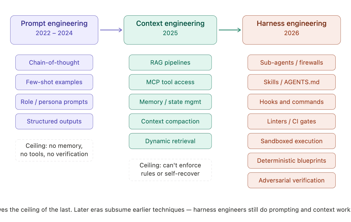 Harness engineering (2026) is the current frontier. It's the infrastructure layer that governs how the model operates. Not just what the model sees, but the constraints, verification loops, and deterministic guardrails that turn a hallucination-prone system into a reliable production tool.